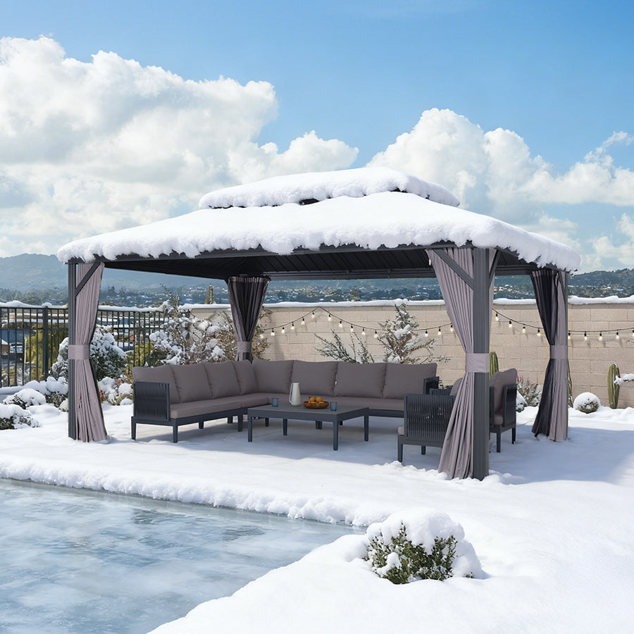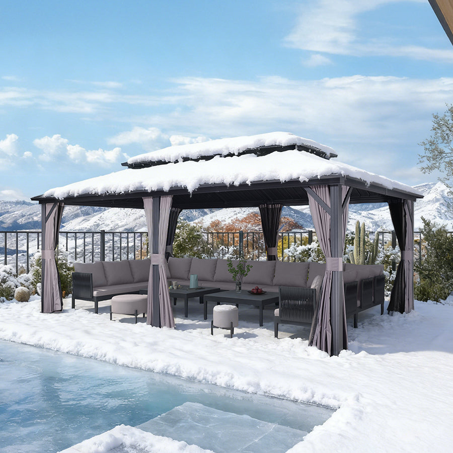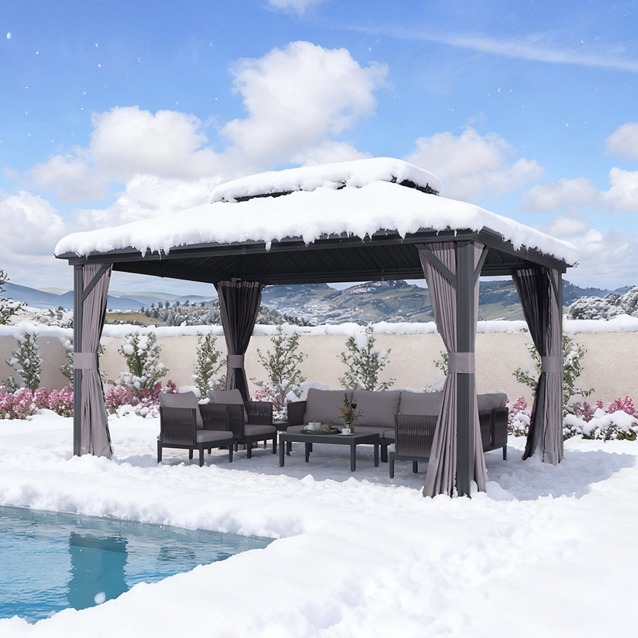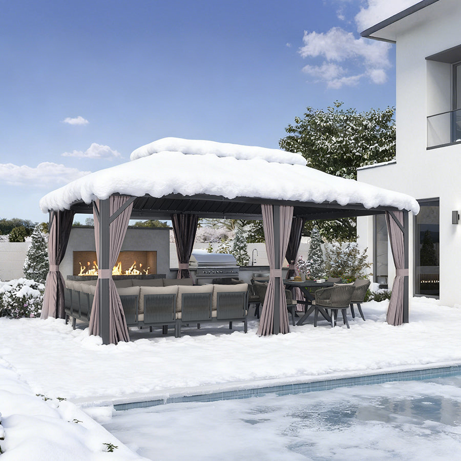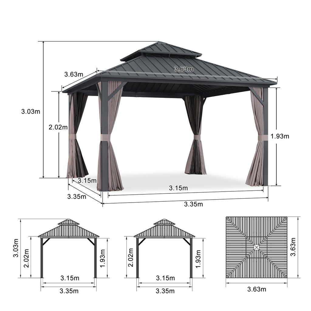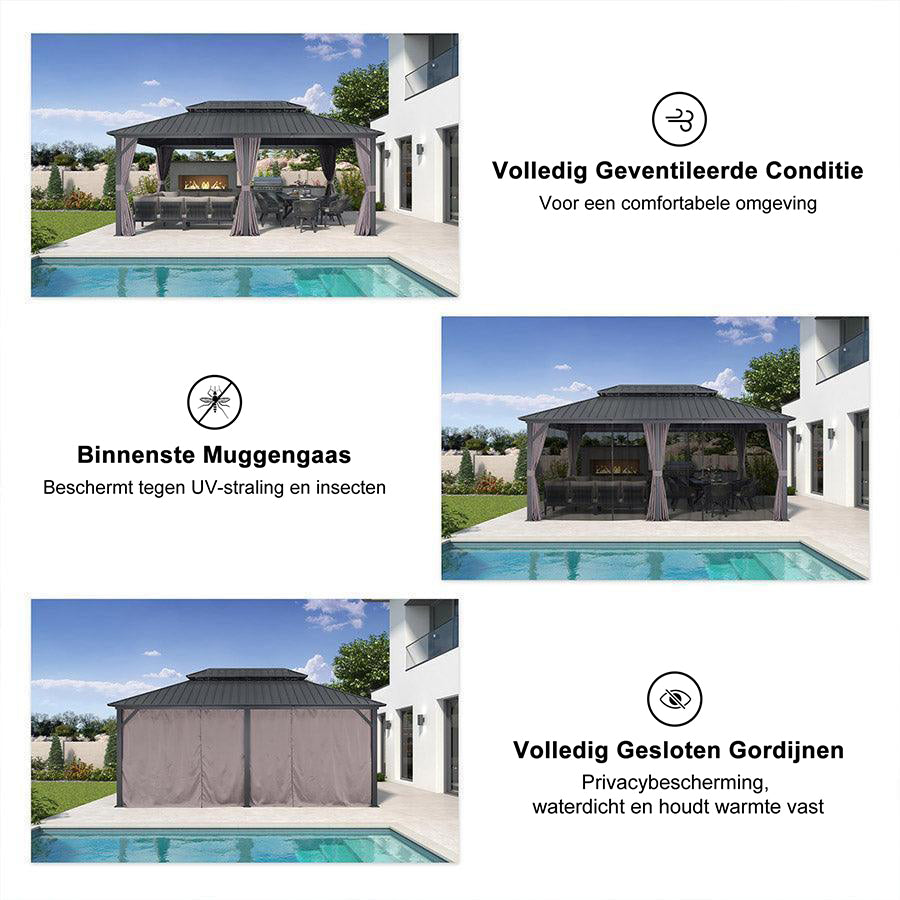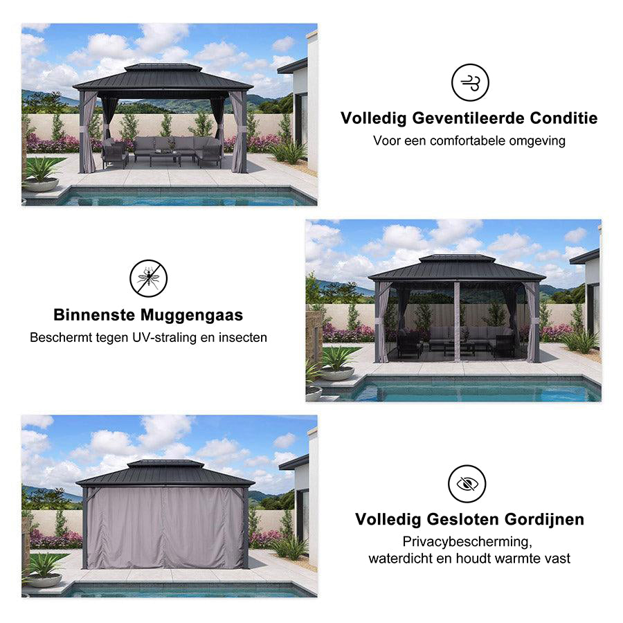 【Poedergecoat aluminiumframe】: Het paviljoen is gemaakt van een stevig en licht aluminiumframe, dat uitzonderlijke sterkte en duurzaamheid biedt. Het is veilig geschikt voor langdurig gebruik buitenshuis.
