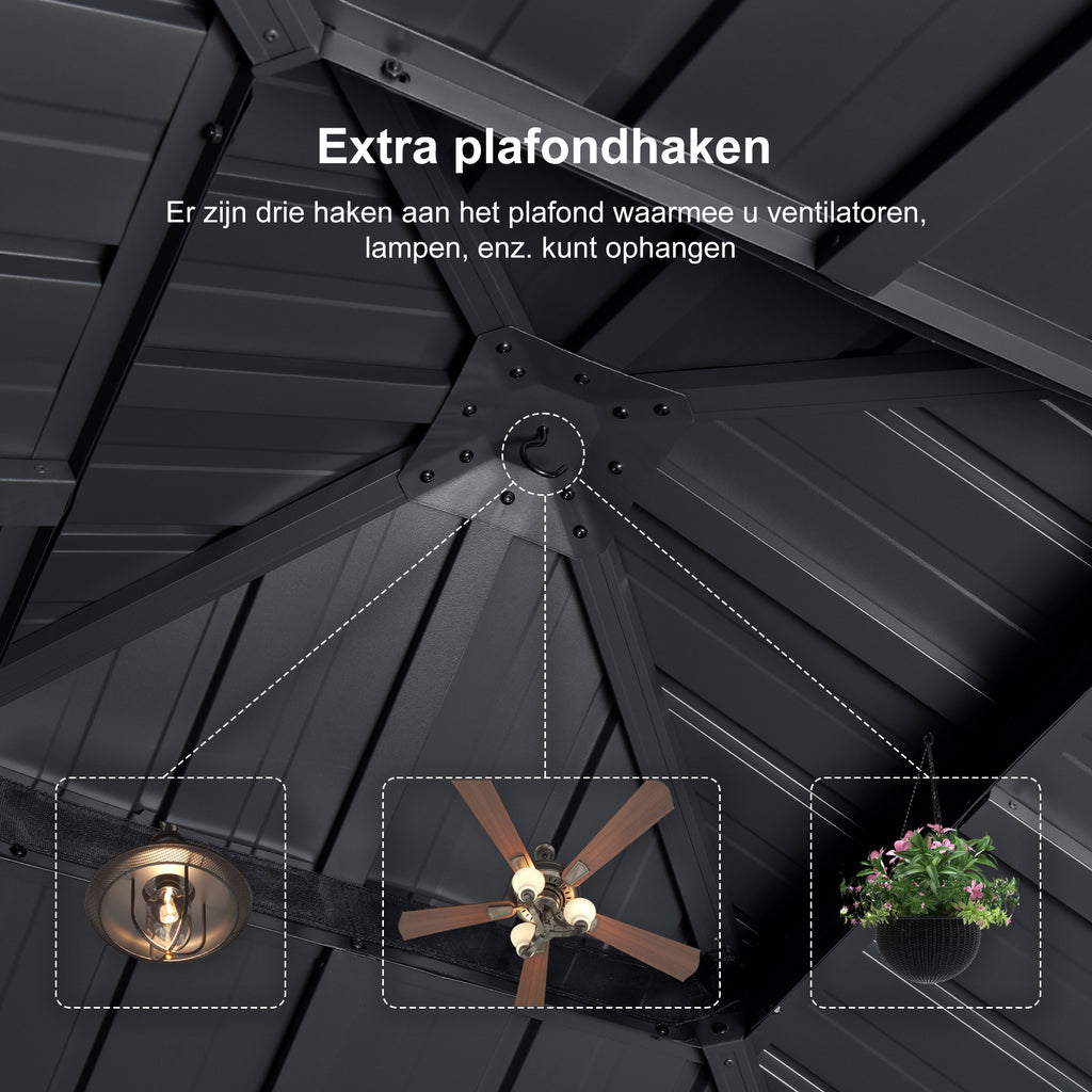 【Plafondhaken】: Geïntegreerde, hoogwaardige en stevige plafondhaken maken het gemakkelijk om uw favoriete kroonluchter of andere decoratieartikelen op te hangen. Het buitenpaviljoen kan moeiteloos worden omgetoverd tot een comfortabele en lichte ontmoetingsplek om waardevolle tijd door te brengen met familie en vrienden.
