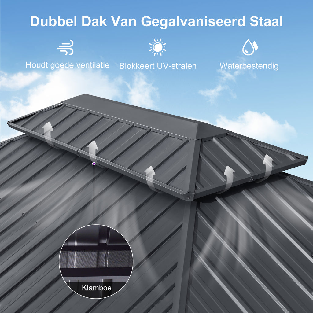 【Dubbel dak van gegalvaniseerd staal】: Het dak heeft een dubbel geventileerd bovendeel voor optimale luchtcirculatie en comfort. Gegalvaniseerd staal beschermt tegen schadelijke UV-stralen.